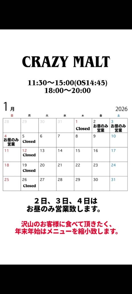 年末年始は上記の営業となります。不規則となりますがよろしくお願い致します。